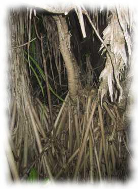 Eine weitere Palmenart, die in einem Art Urwald gedeiht ist die Schraubenpalme, deren offensichtliches Merkmal die Stelzwurzeln und die Ananas-ähnlichen Früchte sind. Auf dem zweiten Photo sieht man die noch unreife und eine bereits reife Frucht der Schraubenpalme. Die reife Frucht soll sogar eßbar sein. Wenn die Frucht überreif ist, verteilt sie ihre Einzelteile über den Boden.