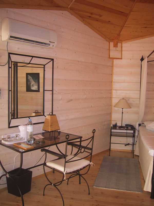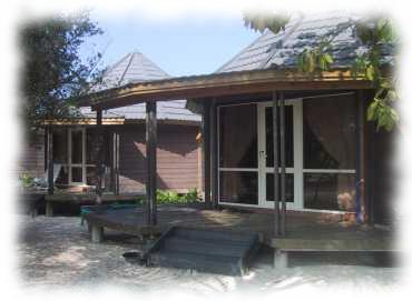 Die Holzhütten waren sechseckig und komplett aus Holz aufgebaut. Vorne hat meine eine kleine überdachte Terasse über ide man auch zur Eingangstür gelangt. Auf der Rückseite ist das offene Bad, das als kleines Anhägsel zum sechseckigen Grundriß angebaut ist.