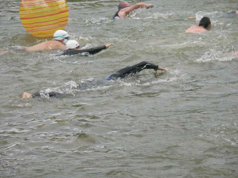 Das Um und Auf für den Schwimmbewerb, war der wärmende Neoprenanzug. Bei knapp 19°C waren die 500m im Hobbybewerb bzw. die 1000m im Hauptbewerb kaum ohne diese wärmende Zusatzschicht zu schaffen. Diejenigen ohne der schützenden zweiten Haut, warteten sehnsüchtig auf den Stiegen auf den Startschuß, während andere diesem entspannt im Wasser entgegensahen.